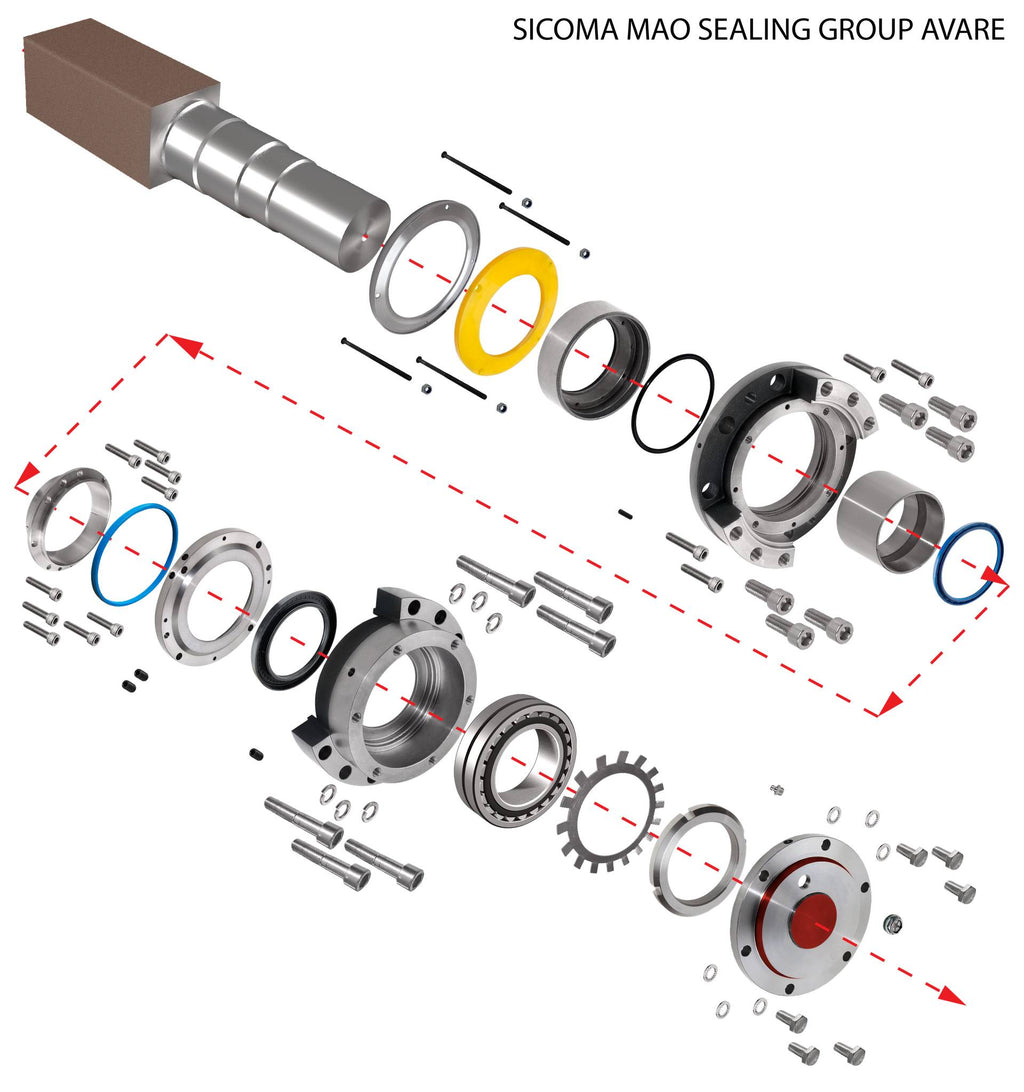 The Sicoma MAO Series Shaft/Bearing Housing Sealing and Component Kit, designated as "AVARE," offers a comprehensive set of genuine Sicoma components essential for the maintenance and overhaul of the shaft and bearing housing assembly in your Sicoma MAO series concrete mixer.