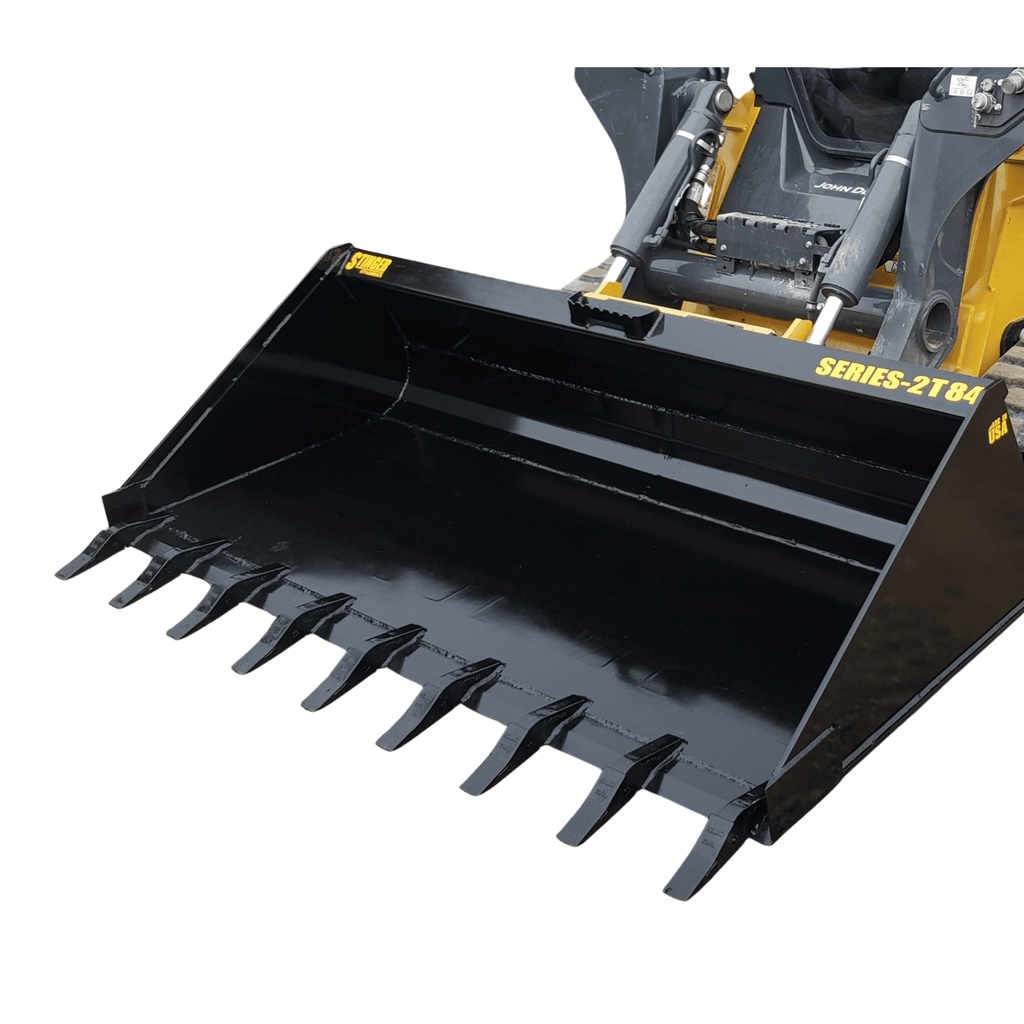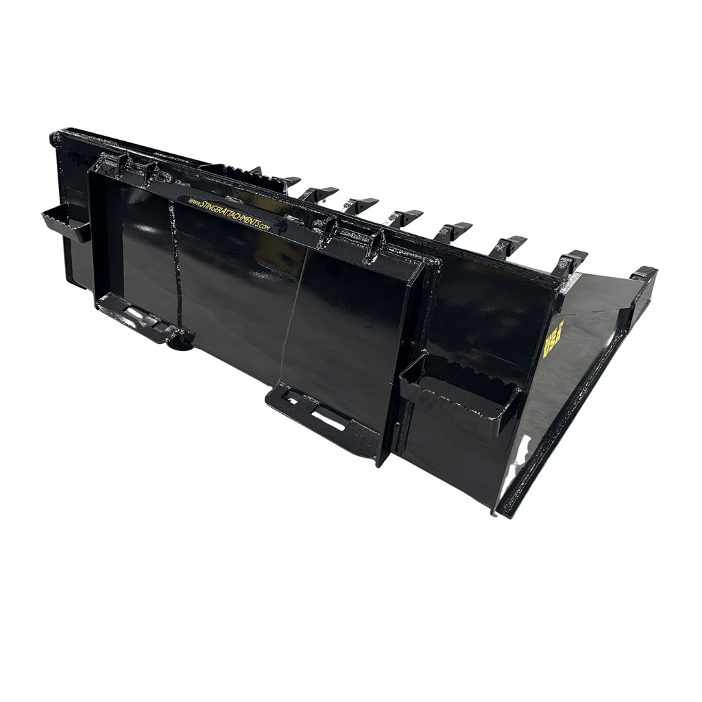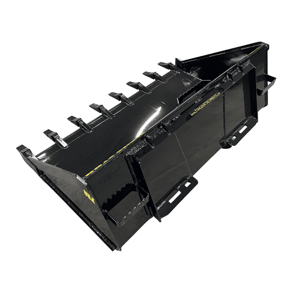 Unlike low-profile dirt buckets that spill material, the TB Series is built on Stinger's Deep-Bottom Chassis (Series 2 dimensions). With a 40-inch bottom depth and a heavy-duty 1/4" Grade 50 Steel Shell, it allows you to break ground and carry a full high-volume load without switching attachments.