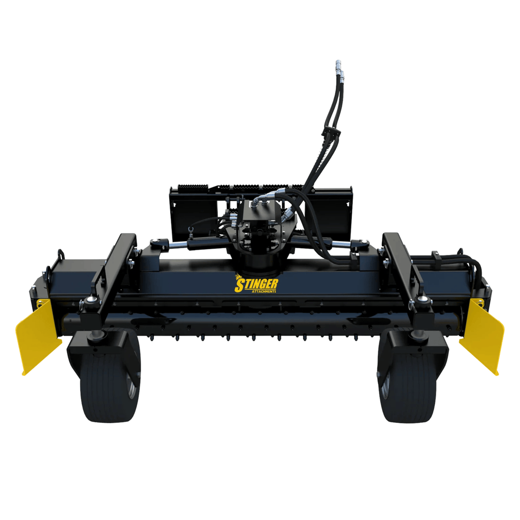 The Stinger Soil Conditioner (Power Rake) is a dual-purpose powerhouse for landscapers and contractors. It doesn't just rake debris; it conditions the soil. The high-speed drum pulverizes hard-packed clods, rips out sod/roots, and separates rocks, leaving a perfect, fluffy seedbed behind.