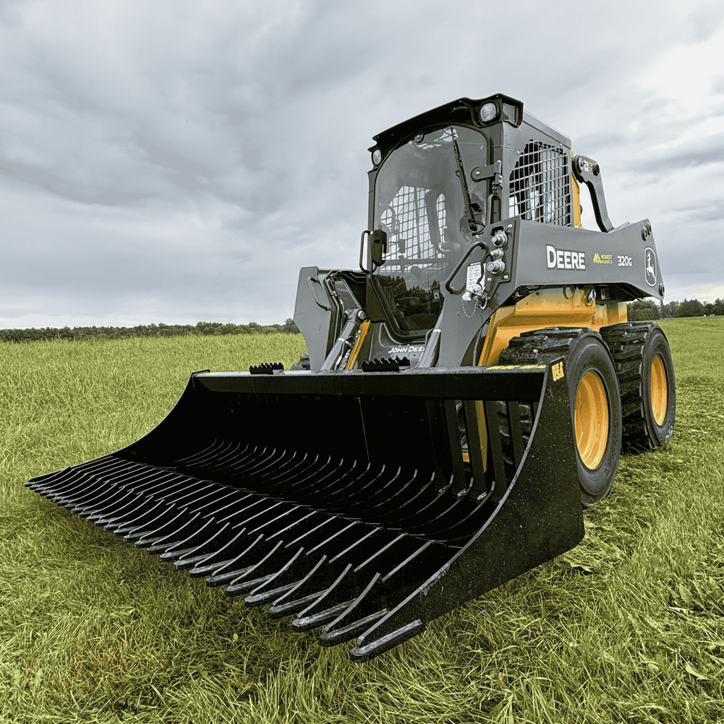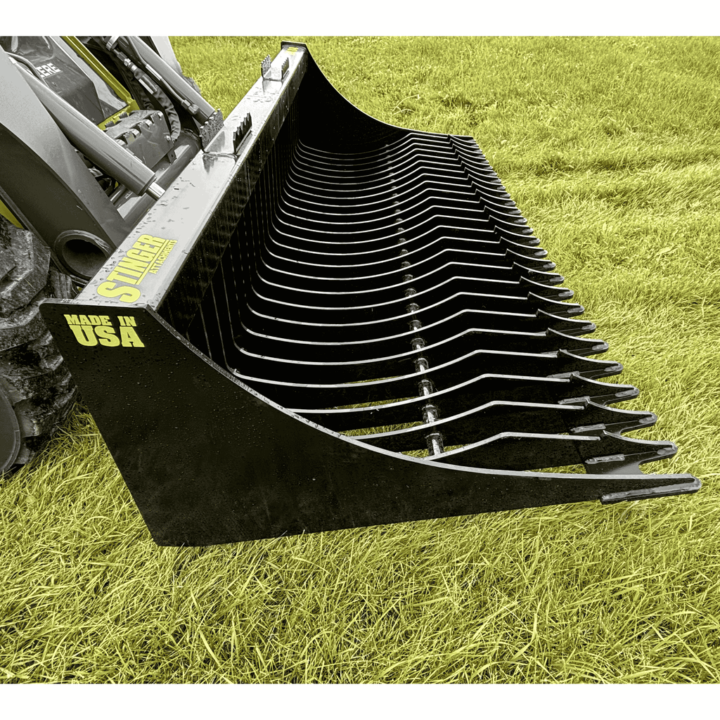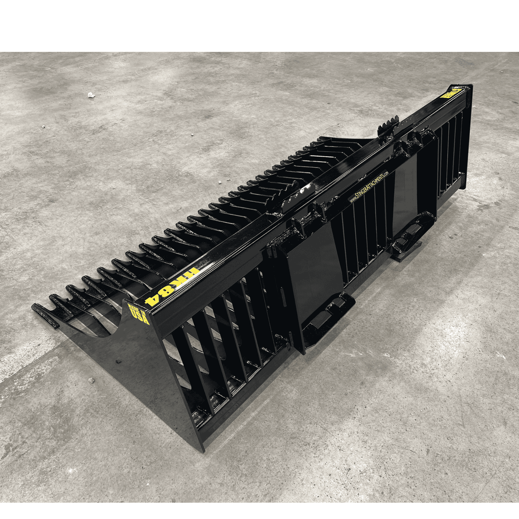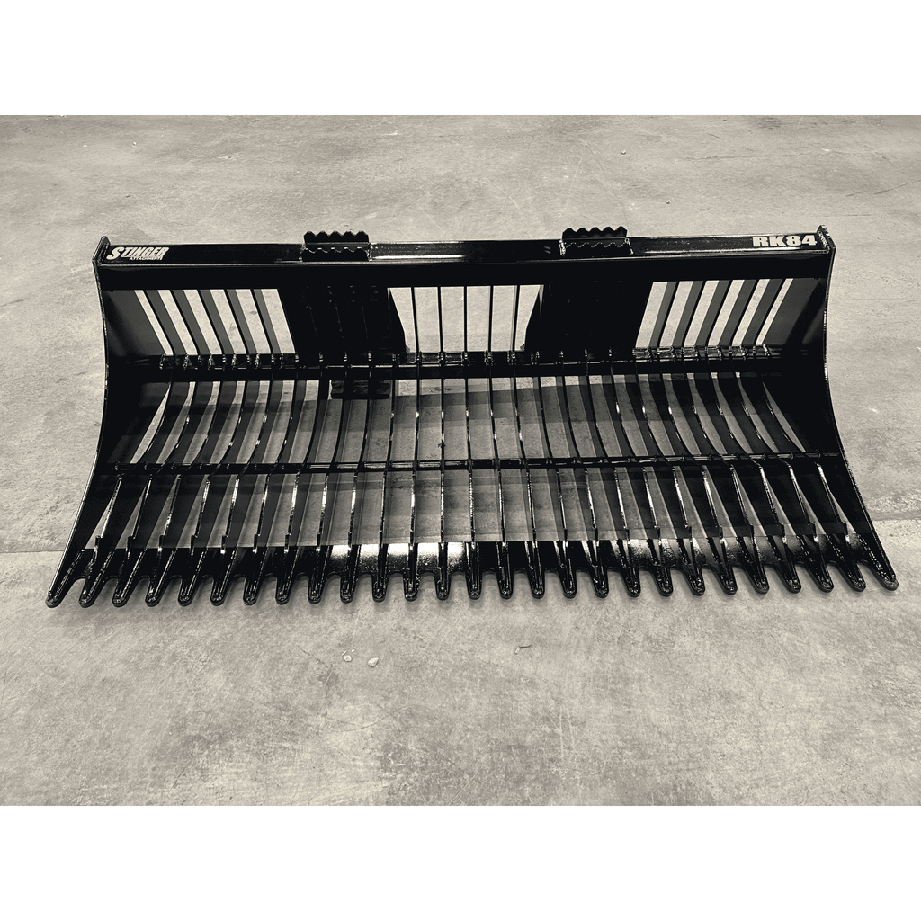 The Industry's Strongest Backbone: The Stinger RK Series Rock Bucket is built to pry, dig, and sift without failure. While competitors use a cheaper 2-piece tine design (welded to the top and bottom of a bar), Stinger utilizes a Solid One-Piece Tine. This 3/8" thick Grade 50 steel tine wraps completely around the 3x3" lower tube, eliminating the common "snap point" found on other brands.