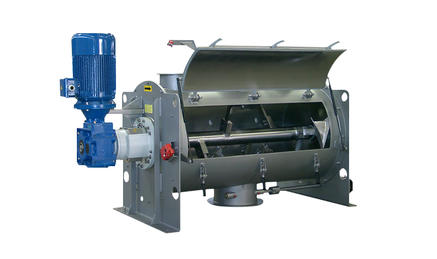 This horizontal mixer features a single shaft equipped with ploughshare or shovel tools that mix materials within a tubular mixing drum. The design and operation of the mixer—specifically, the shape, position, and rotational speed of the tools—generate a centrifugal vortex motion, allowing the ingredients to be projected in a three-dimensional manner, ensuring thorough and consistent blending.